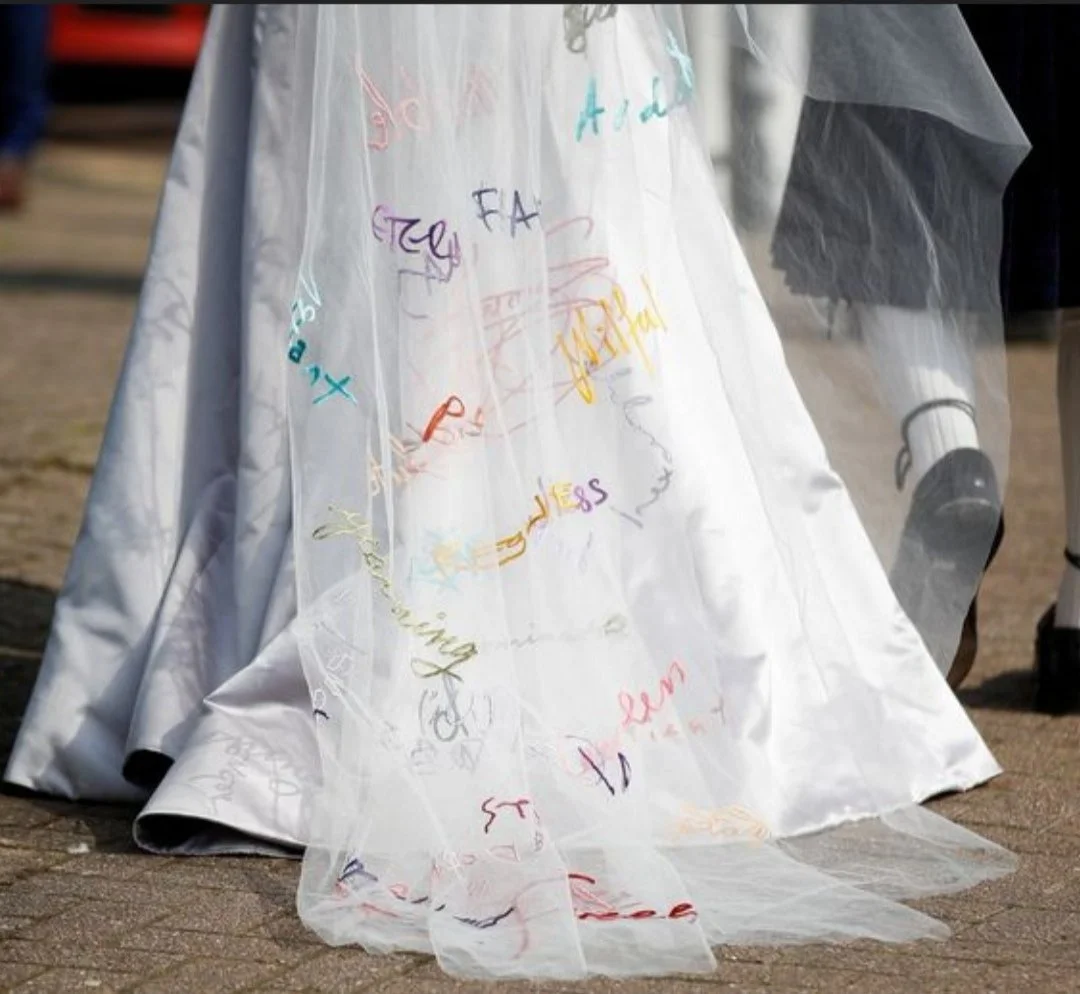 Close up, the details on the dress were extraordinary. The cloisonne buttons were uniquely designed and commissioned by Vivienne for this gown, and she had herself embroidered a message of solidarity, love and support on one panel. The long veil was hand embroidered, with bright multicoloured words striding across the gauze. These were words chosen by Julian as descriptive of the Power of Love, and they were in the handwriting of close friends and family who were not able to be inside the jail, including Stella’s 91 year old father. I am proud to say one of those handwritings was mine, with the word “inexorable”. It really was embroidered on looking exactly as I wrote it, as witness the fact nobody could tell what it said. Julian’s chosen motif for the wedding was “free, enduring love”.