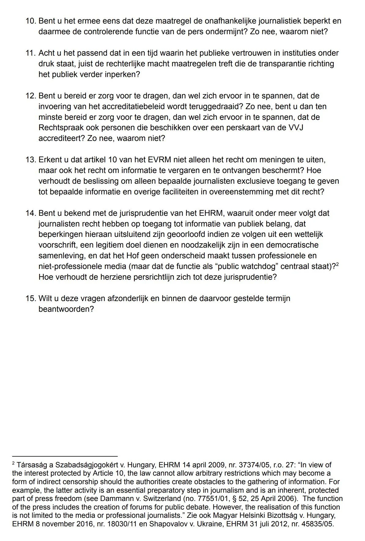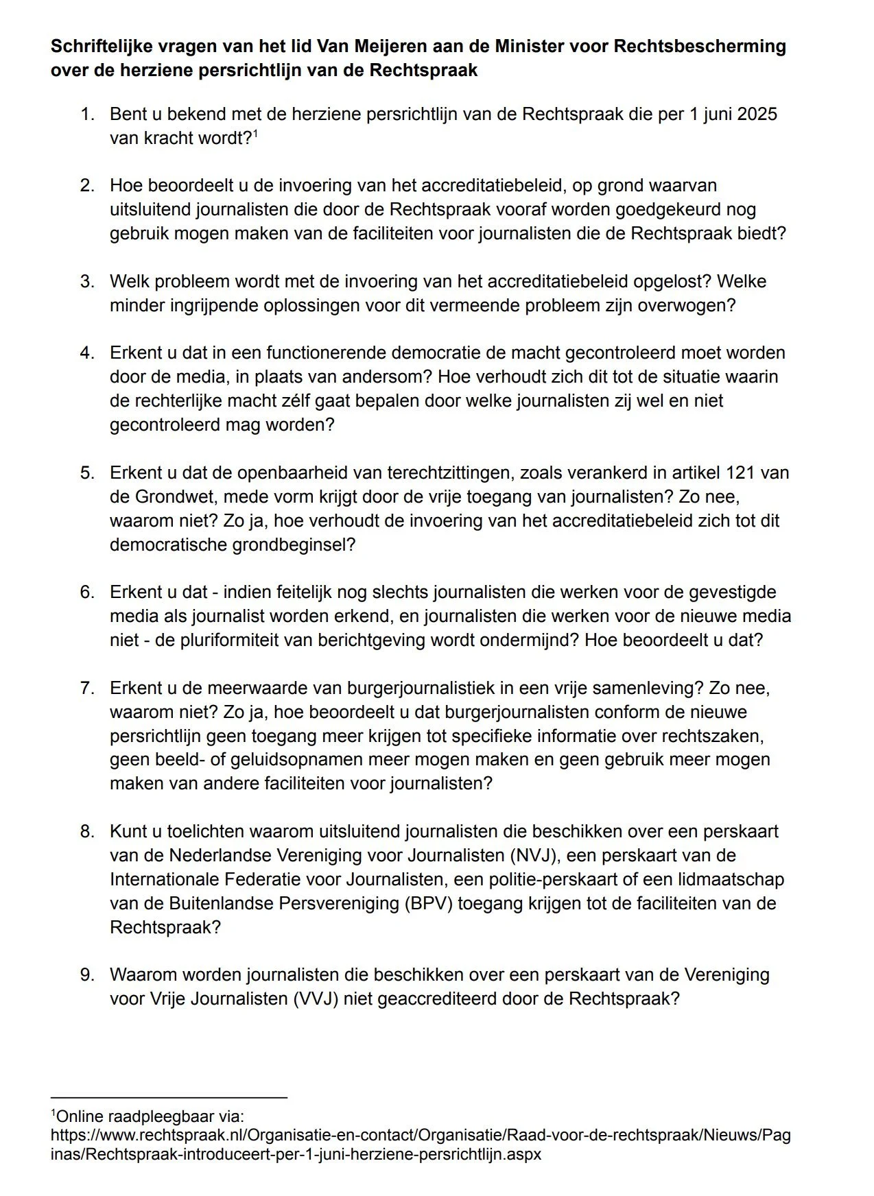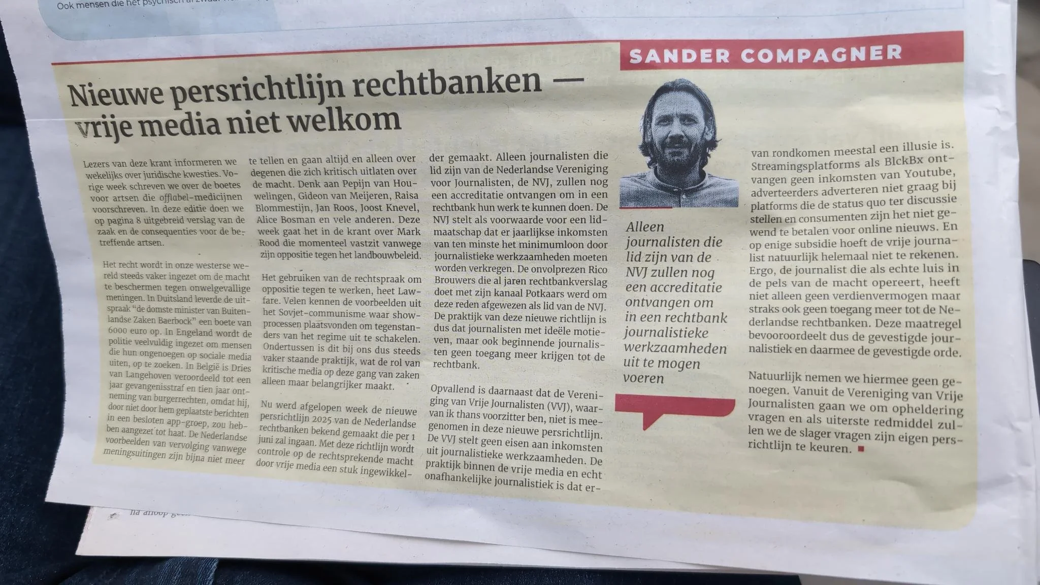 In Nederland is er niet alleen de NVJ, maar ook de vereniging van vrije journalisten, de VVJ. In 2024 schreef ik de NVJ, de VVJ en de Raad voor de Rechtspraak aan met mijn zorgen over het gebrekkig naleven van de oude persrichtlijn (lees de brief). Alleen de Raad voor de Rechtspraak stuurde mij een antwoord terug (lees het antwoord). De andere krant, waarvan de redacteur tevens voorzitter is van de VVJ schreef over de nieuwe persrichtlijn in de krant van 22 maart een column.