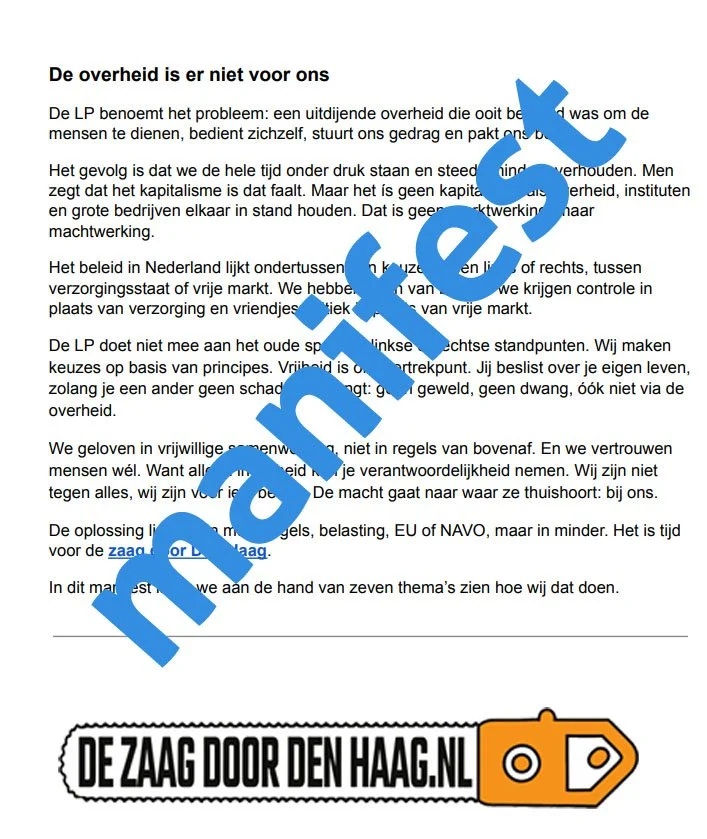 Het LP verkiezingsmanifest is geschreven. (link naar eerste versie). Lijsttrekker Tom van Lamoen vertelt over 'de zaag door Den Haag' en de voorbereidingen voor de Tweede Kamerverkiezingen van 29 oktober: http://dezaagdoordenhaag.nl