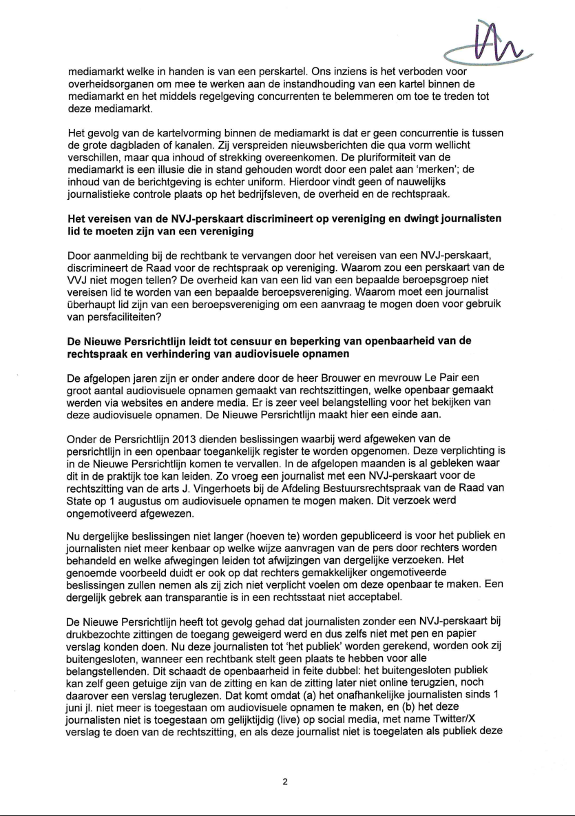 Advocaat Meike Terhorst heeft namens de Vereniging van Vrije Journalisten (VVJ) en rechtbankjournalisten Djamila le Pair en Rico Brouwer de Raad voor de rechtspraak gesommeerd de nieuwe persrichtlijn die per 1 juni is ingegaan in te trekken. Volgens de journalisten leidt de nieuwe persrichtlijn tot discriminatie, uitsluiting van journalisten en illegale beperking van de openbaarheid van rechtszittingen. Wanneer de Raad voor de rechtspraak geen gehoor geeft aan de sommatie, wordt er door de eisers een gerechtelijke procedure gestart.