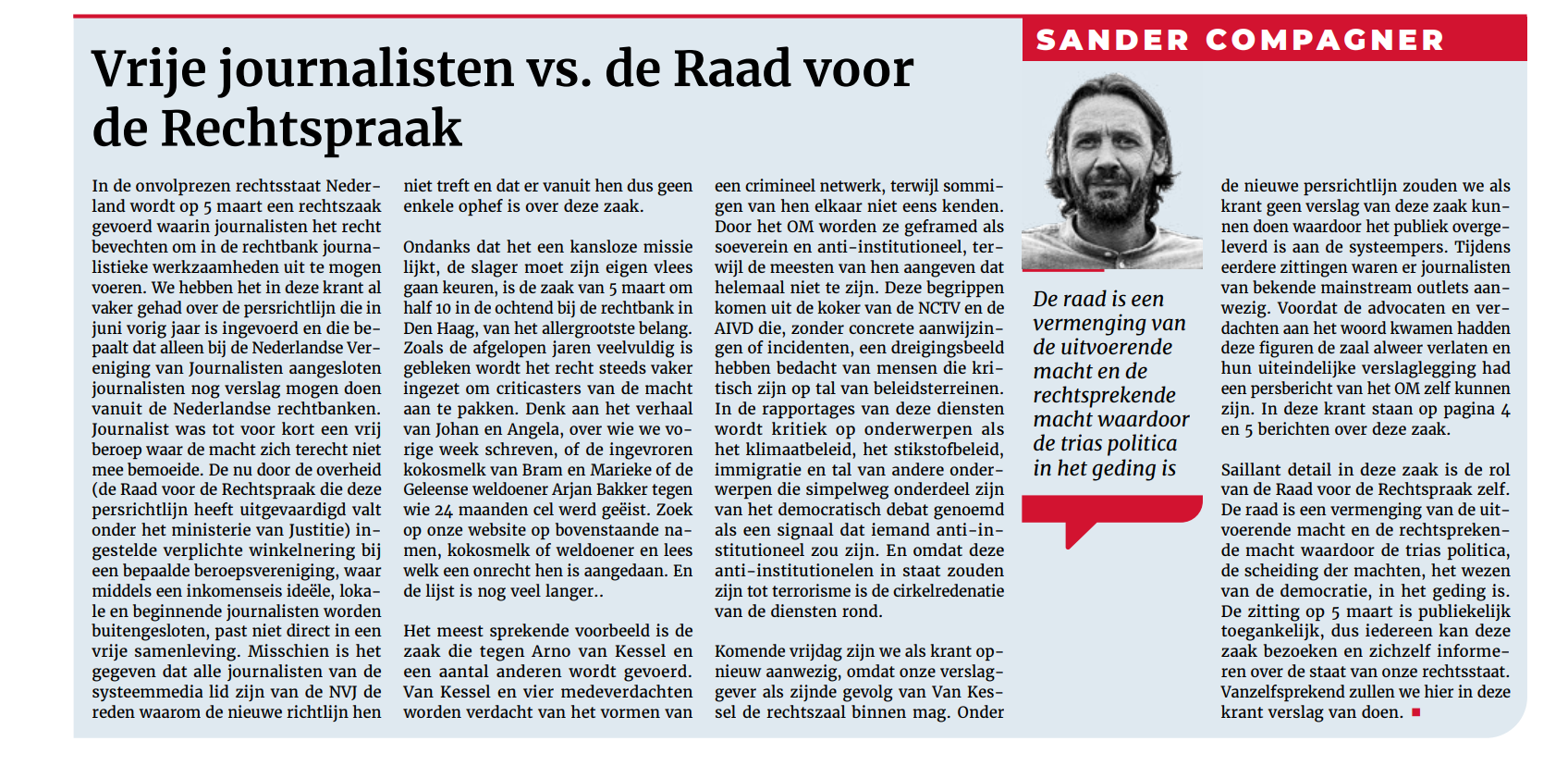 Op 5 maart 2026 diende een rechtszaak die in september 2025 werd aangespannen door de Vereniging van vrije journalisten, Djamila le Pair en mijzelf Rico Brouwer. We werden bijgestaan door twee advocaten: Meike Terhorst en Willem de Boer. Gedaagden waren de Raad voor de Rechtspraak en de Staat der Nederlanden (waaronder de gerechten vallen). Het verweer voor deze partijen werd gevoerd door twee advocaten van de landsadvocaat en een juridisch adviseur namens de gerechten.